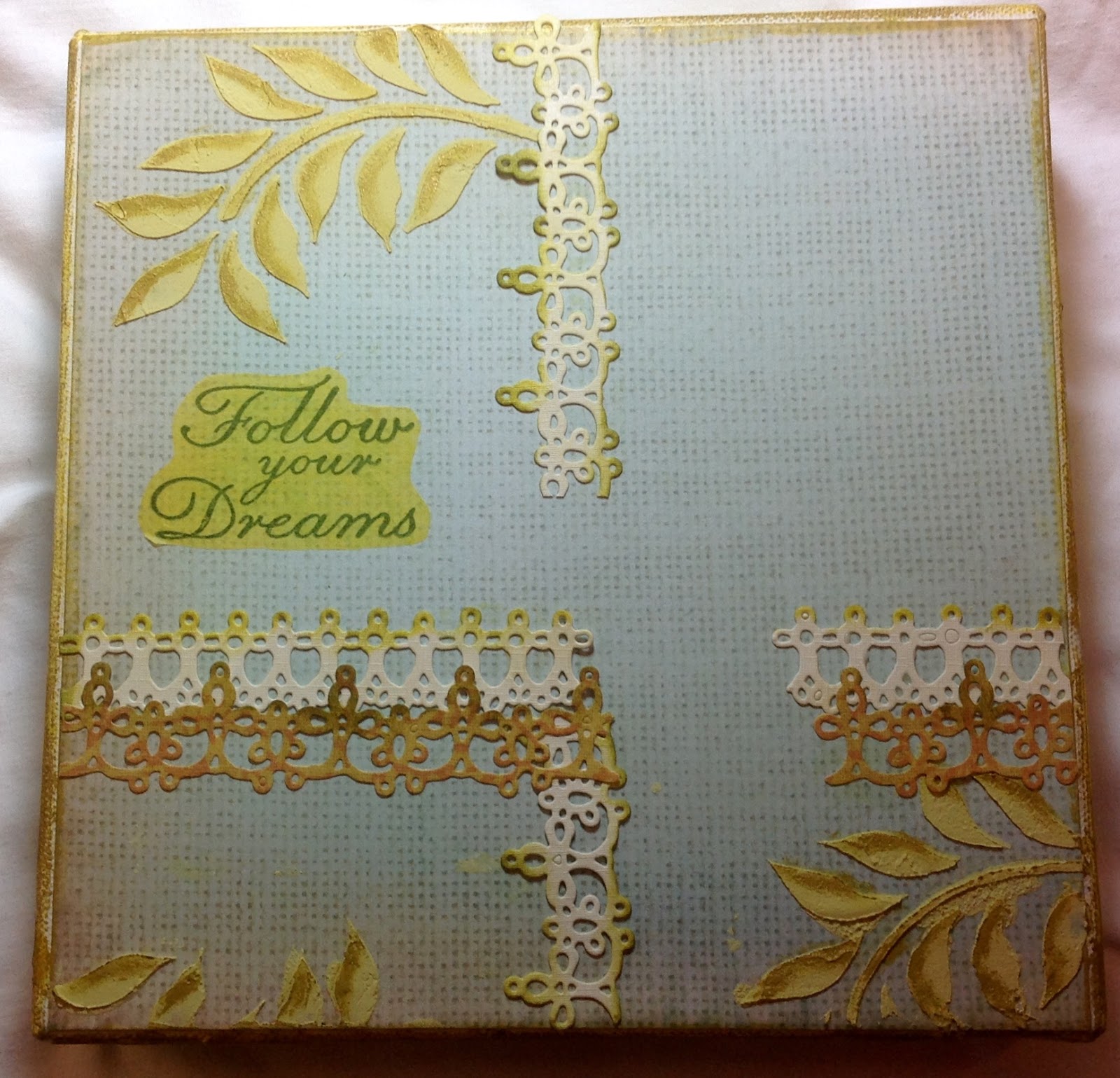 Then I die cut some lace using Tim Holtz's new die.....loving it, and distressed the edges with some distress inks. I stamped a sentiment from Lin Browns new stamps onto tissue and glued that down. I added some dimension to the leaves by applying some Treasure Gold with a brush.